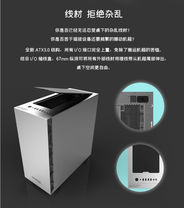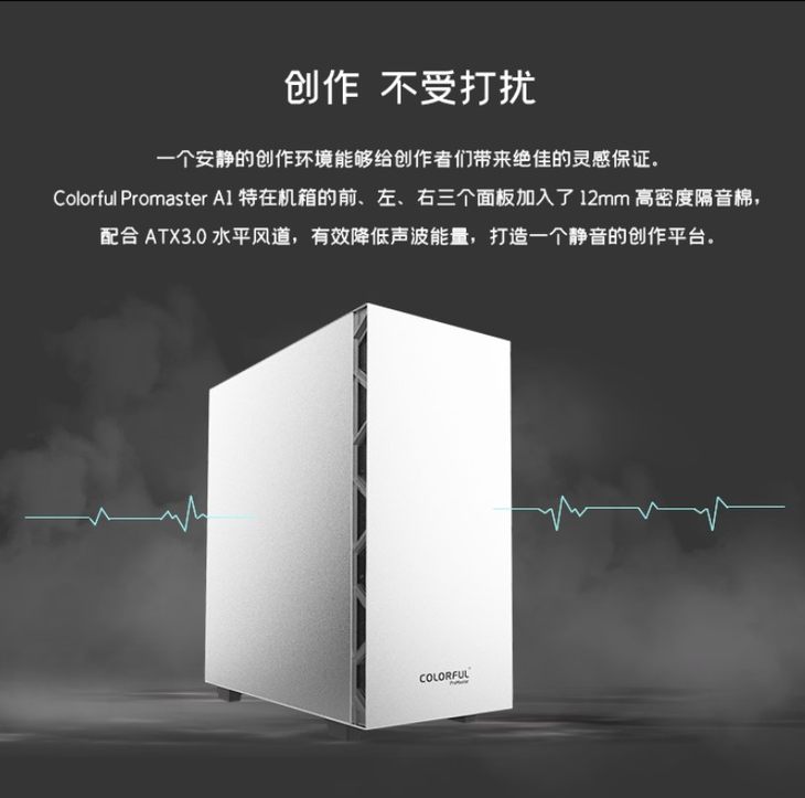 自七彩虹发售桌面高性能台式机以来,绝大部分产品都采用了灰色域配合环境光影效果作为主视觉,而Colorful ProMaster A1则是先进采用珠光白的产品,特殊的工艺和色彩搭配,依然能在环境光影的变幻中呈现更为柔和、耐看的效果。