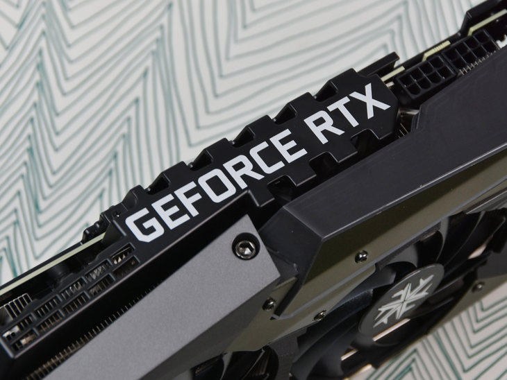 显卡顶部可见金属背板延伸出来的加固支架(上面印有“GEFORCE RTX”的字样),有助防止PCB弯曲变形。
