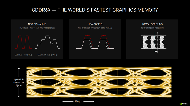 相比GDDR6,全新的GDDR6X最大的改进就是在显存上先进使用了PAM4编码,这种编码的方式可以让显卡在更短的周期内传输更多数据,最大显存速度也提升至了19Gbps,让GDDR6X拥有超过1TB/s的理论显存带宽上限,也可以在同样的频率下实现更高的显存带宽。