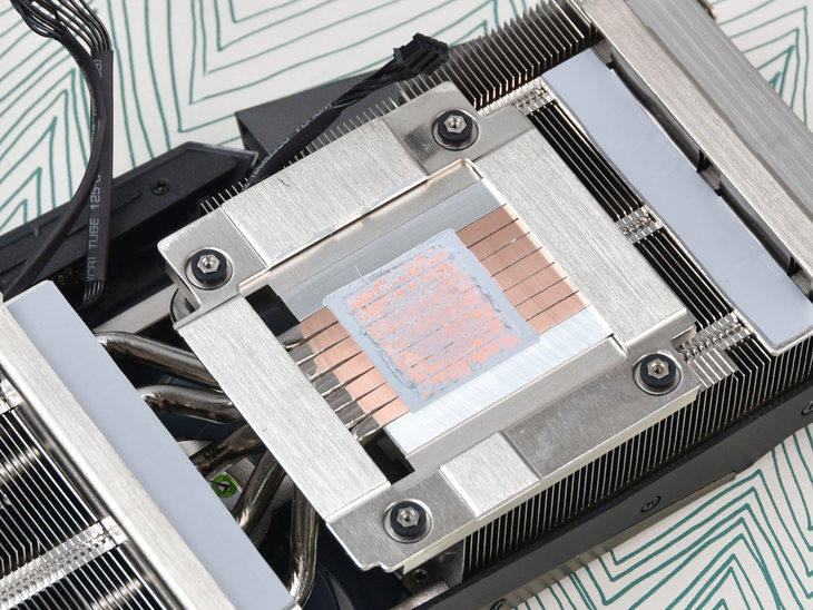 这款散热器的金属主体也是相当的庞大,不仅能够为GPU进行散热,而还能够为显存和MOS管进行散热。7根热管直触GPU设计,如此的散热堆料实属豪华。