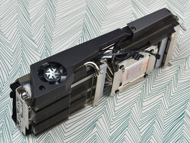 这款显卡虽然长度达到了30.5cm,但是它的PCB并不长。通过对比明显能够看出散热器比PCB要长出不少。