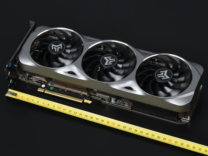 由于采用了三风扇散热设计,影驰RTX3090金属大师显卡的尺寸比较长。经过笔者的实测,这款显卡长度将近32cm。