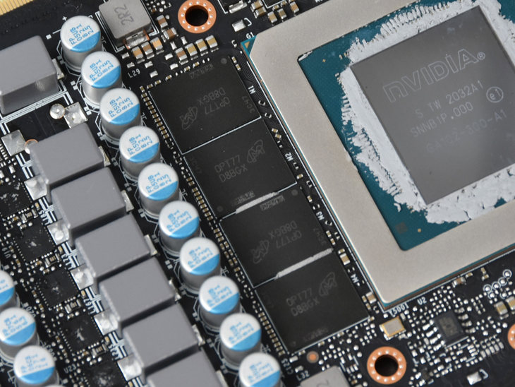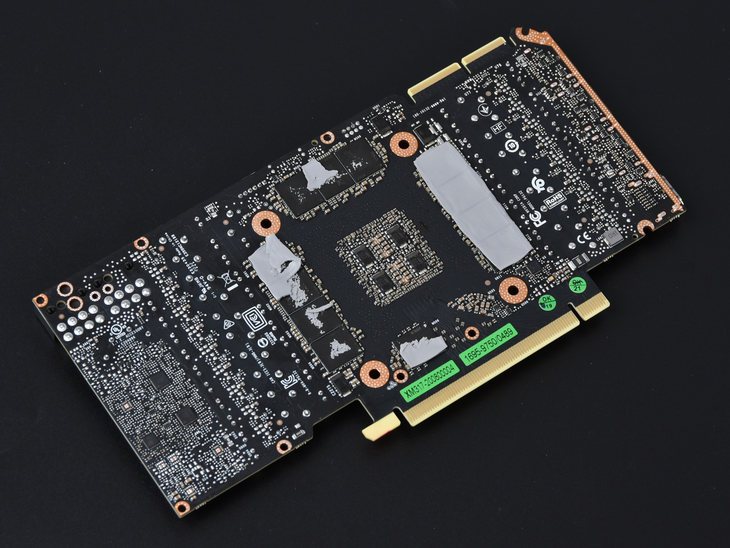显存是来自美光的GDDR6X,型号为OPT77 D8BGX,单颗1GB容量。这款显卡PCB正面设计有12颗显存,PCB背面设计有12颗显存,共计24颗,组建了24GB显存容量。
