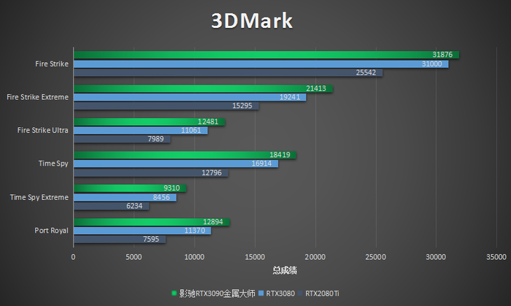 从3DMark基准测试的成绩来看,影驰RTX3090金属大师显卡相比RTX3080有了一定的性能提升,但是没有它们之间的价格差距这么大。