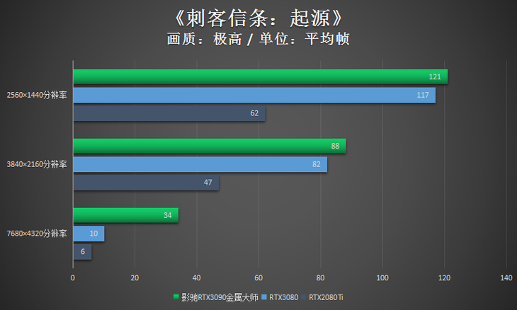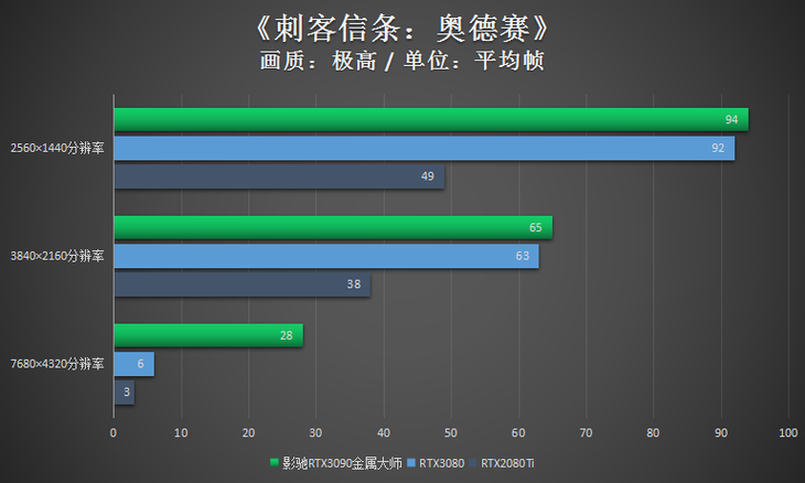 还有,在8K分辨率,高画质下,面对《刺客信条:起源》和《刺客信条:奥德赛》这两款游戏,RTX3080显卡都出现了爆显存的情况,看来10GB显存应对8K游戏确实有些力不从心。这样来看,RTX3090的24GB大显存在未来无疑是大有可为的。