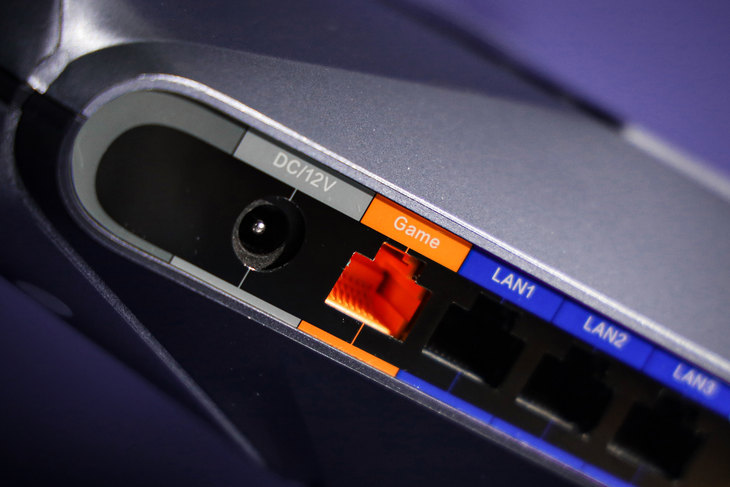 产品背面集成了所有的接口和开关,从左到右依次是:电源接口、4个LAN接口(其中包括一个专为游戏设计的独立LAN口)、2.5G/WAN端口、两个USB3.0口、复位孔。其中高速2.5G WAN端口,传输速度是传统千兆口的2.5倍,理论高传输速度可达312.5MB/S。