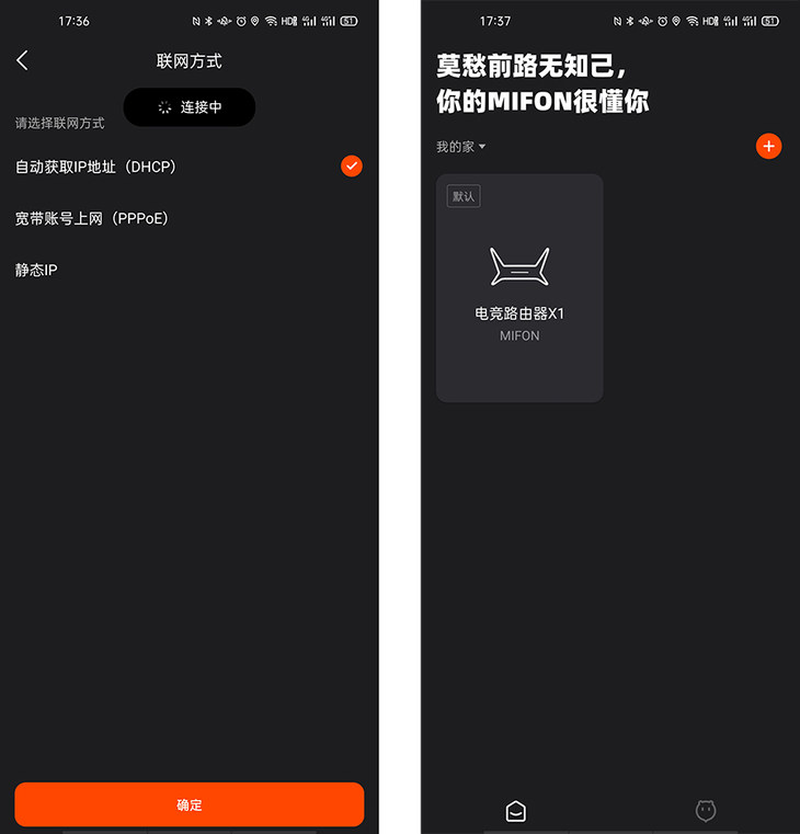 在手机端,可通过扫描包装盒上的二维码来下载“MIFON”APP应用软件,支持安卓与iOS系统。连接上MIFON X1电竞路由器的WiFi信号后,进入软件选择联网方式,和PC端一样我们可以自动获取IP地址,快速连接上手机,在点击确定后就会显示也连接的路由器设备。