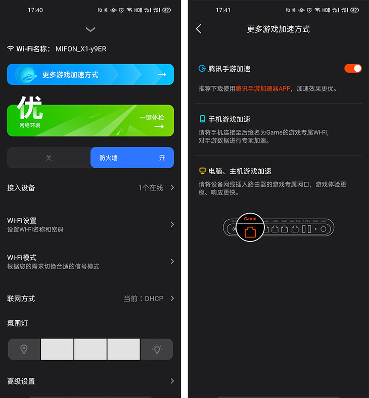 同样的,手机APP端的界面设计与PC端都采用的相同的风格,高级之余电竞感十足。游戏功能设置是这款攀升MIFON X1电竞路由器的核心卖点,内置了手游电竞模式,通过单独的WiFi线路和游戏LAN端口可对手游以及电脑、主机游戏单独进行加速优化,并且设有专门针对腾讯手游加速等多重功能。游戏模式的加入,通过软硬件结合的方式,可以实时根据不同游戏的爱好进行专属的电竞网络设置。