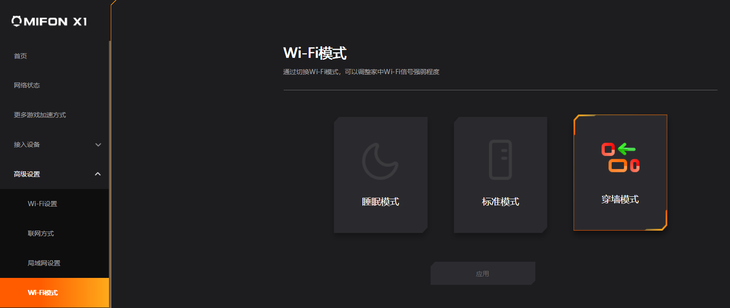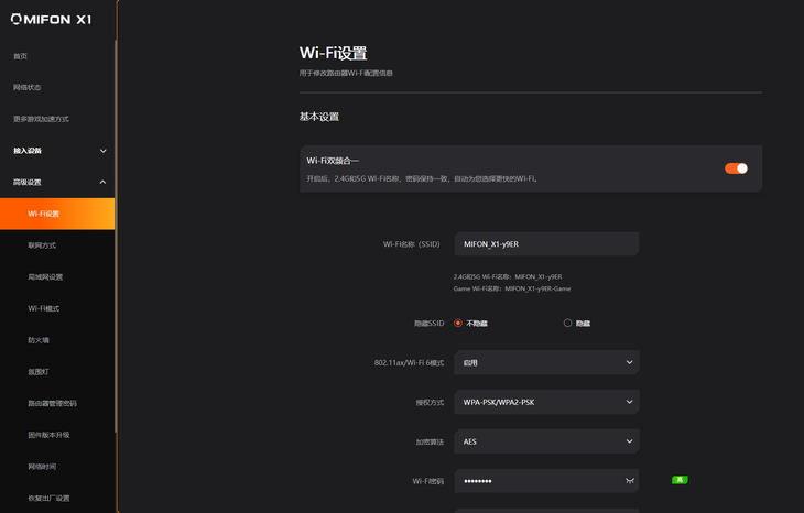 打开路由器PC管理界面,高度定制化界面相比传统路由器来说确实霸气不少,整体的风格与配色也极具电竞感,下方中间位置这款MIFON X1电竞路由器主打的QoS游戏加速功能也十分明显。