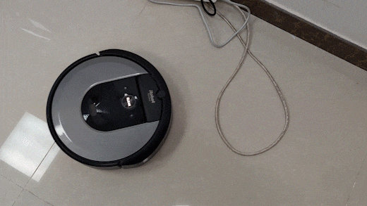对于电线来说,irobot i7几乎发现不了它的存在,要么是推走,要么是直接碾压过去。如果是想电源线这样较粗的线材还好,如果是充电线,那么被卷入滚刷的几率还是非常高的。