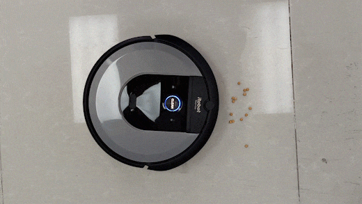 irobot i7,在清扫黄豆的时候,因为机身底部的缝隙较小,体积较大的黄豆无法通过滚刷与地面的缝隙,因此无法顺利的被吸入到尘盒当中,反而会因为单侧边刷的清扫而四散分开。