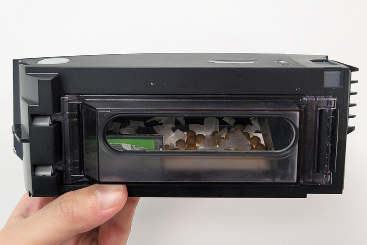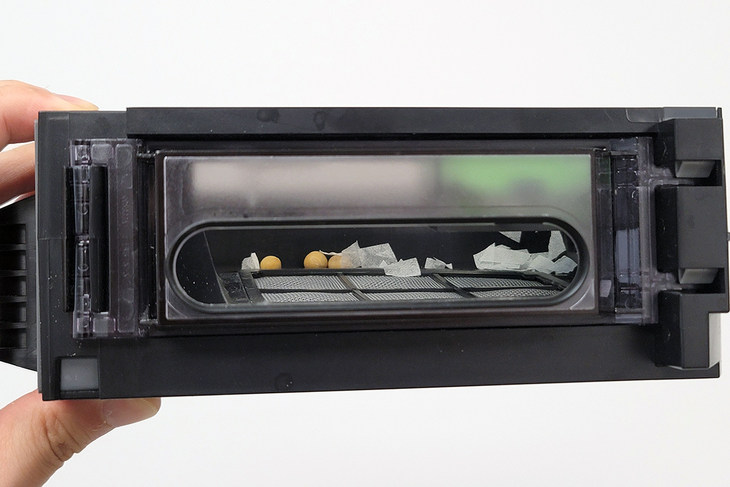 在尘盒中,有一些黄豆和碎纸屑,我们来看一下irobot i7的自动集尘功能效果如何。