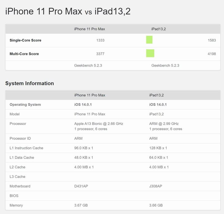 因为目前暂时没拿到iPhone 12真机,我们可以参考一下网上曝光的跑分数据以及搭载A14芯片的iPad Air4在性能部分的表现。