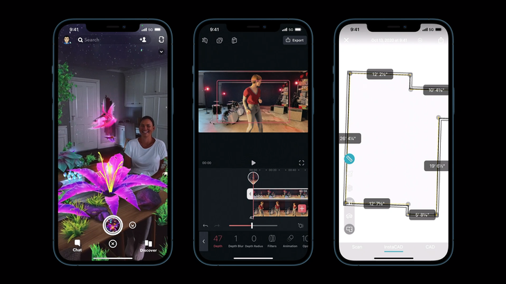 除此之外,iPhone 12 Pro还加入了激光雷达扫描仪,搭配A14芯片的机器学习能力和iOS 14的深度信息框架,iPhone 12 Pro可以对物体和房间进行扫描,建立具有准确深度信息的场景,可以在增强现实中精准放置物体,另外还可以解锁丰富的应用场景。