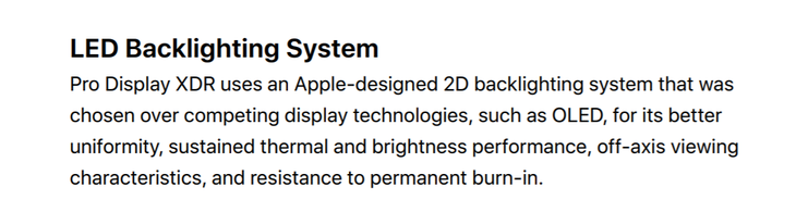 在苹果Pro Display XDR显示器官方公布的技术文档可以看到,之所以选择类似Mini LED技术而不是OLED等技术,主要是因为屏幕更好的一致性和持续亮度性能,以及不易烧屏带来长寿命等特点,这些也是Mini LED技术的优势所在。