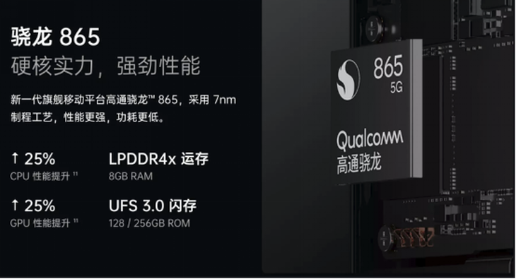 骁龙865移动平台采用了 7nm工艺,在CPU方面,骁龙865的Kryo CPU拥有八个核心,采用的是1+3+4的架构,其中超级核心和性能核心都是基于ARM A77架构,高频率分别为2.84GHz和2.40GHz,四个效率核心则是基于ARM A55架构,高频率为1.80GHz。