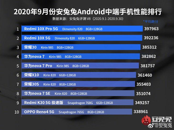 性能是Redmi 10X的一大亮点,Redmi 10X搭载天玑820芯片,采用7nm工艺制程,内置5G基带,支持SA/NSA双模5G。从安兔兔公布的安卓中端手机性能排行榜中可以看到,Redmi 10X平均跑分达到39万+,天玑820芯片霸榜领先、第二名,足以证明这款芯片的性能实力。