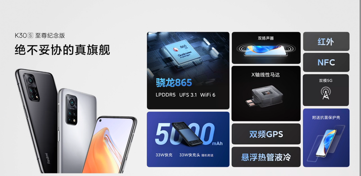 核心配置上,Redmi K30S至尊纪念版搭载骁龙865处理器+LPDDR5内存+UFS3.1闪存,提供悬浮热管液冷散热加持,内置5000mAh电池,支持33W快充,配备双扬声器和X轴线性马达,支持红外遥控、NFC和双模5G。