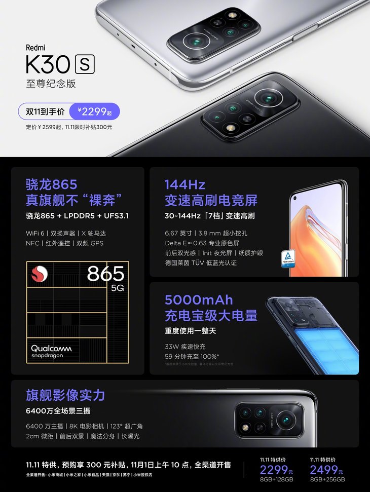 Redmi K30S至尊纪念版的价格是本次发布会的最大惊喜:原价8+128GB版本2599元,8+256GB版本2799元,双十一粉丝称赞300元补贴,到手价低至2299元起!