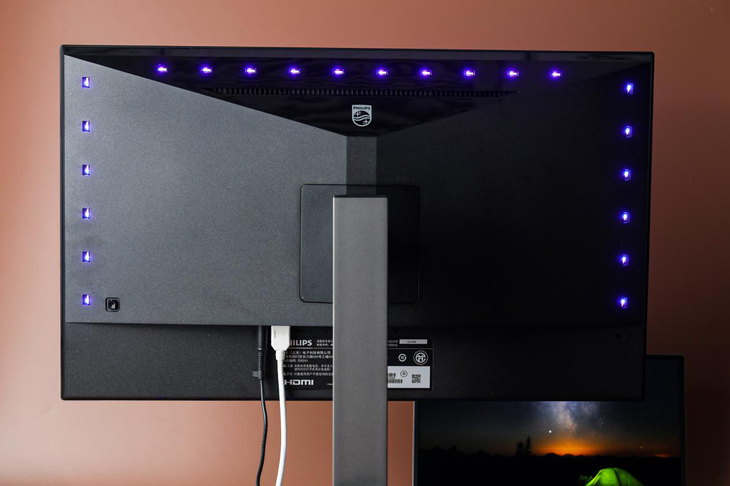 外观方面,飞利浦275M1RZ采用三边窄边框设计,给用户带来更加震撼的视觉效果。T字形的金属支架,摆放十分稳固。支架区域背后还设计了理线槽,避免显示器连接线复杂导致的桌面杂乱。在显示器背后,还拥有不少LED流光溢彩灯珠,开启后,能自动识别屏幕显示内容,自动调节灯效,也可以设置自动模式随机变幻灯光效果,让玩家在游戏、观影时享受到沉浸式体验。