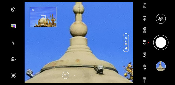 华为Mate40 Pro在拍照界面选择下方的4个“点”来实现超广角、主摄、5X变焦以及10X混合变焦的切换,而双指放大取景画面则可实现高50X的数码变焦,并且非常贴心的是在超过一定的变焦倍率后,在取景界面的左上角会出现一个小框,里面会提示变焦的范围,更好的帮助我们进行远距离拍摄取景与对焦。