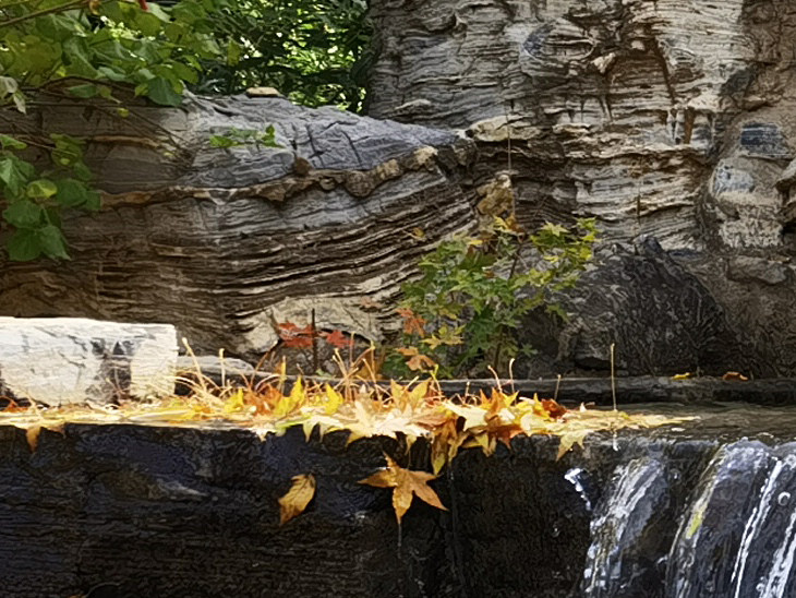 从实拍样片的放大截图来看,华为Mate40 Pro的1/1.28英寸系列搭载5000万像素超感知主摄,确实在细节表现上可圈可点,但即便是100%放大后无论是假山岩石的层次细节、质感还是杂乱的落叶都分毫毕现,尤其是高反差场景下的水流位置也有非常棒的动态范围。