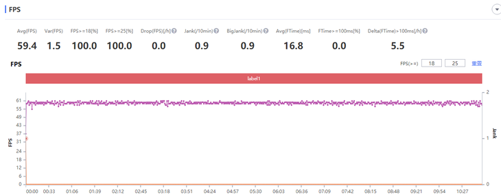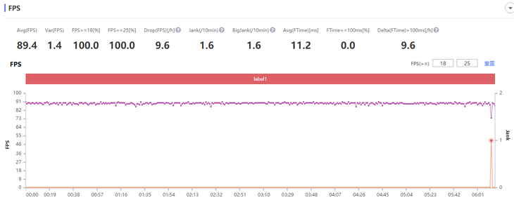 《和平精英》的平均帧率为89.4帧,更高的帧率也带来更为流畅的游戏体验。可以看到游戏过程中帧率能够稳定的维持在90Hz的水平。