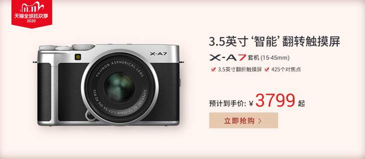 这款富士X-A7作为目前热门的vlog拍摄利器双十一促销价仅为3899元>>点击购买,领券后还能再减100元,3799元的售价要比之前便宜将近一千元,并且还送32G SD卡,非常值得入手。同时X-A7丰富的色彩与超大的翻转屏,也非常适合女生使用。