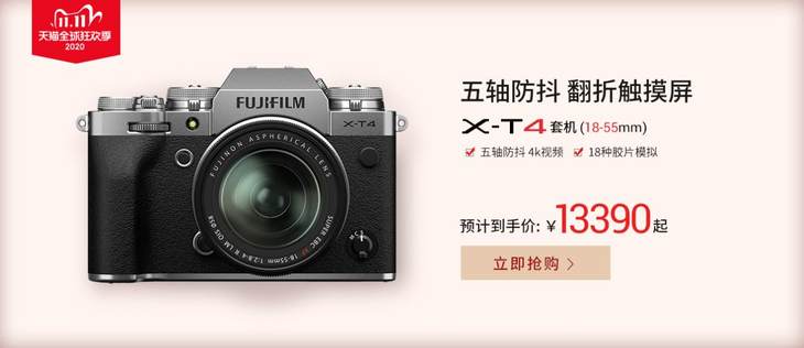 作为目前富士X系列无反的优异旗舰,X-T4各方面的性能都非出色,是追求优异拍摄体验以及视频拍摄的优异器材。在双十一当日0点可在富士天猫官方旗舰店参与14890元减1500元活动,搭配18-55mm镜头套机到手价仅13390元>>点击购买,算是近段时间的低价了,并且当日购买还多送一块原装电池。