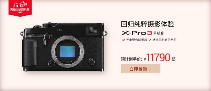 这款超高颜值的富士X-Pro3无反相机在今年的双十一促销非常够诚意,在11月11日当天0点后可参加满9000元减400元活动,单机身到手价低仅需11790元>>点击购买,并且买就送原装相机包、原装电池以及超大容量的128G存储卡,再不入手可能就得等到明年618元哦。