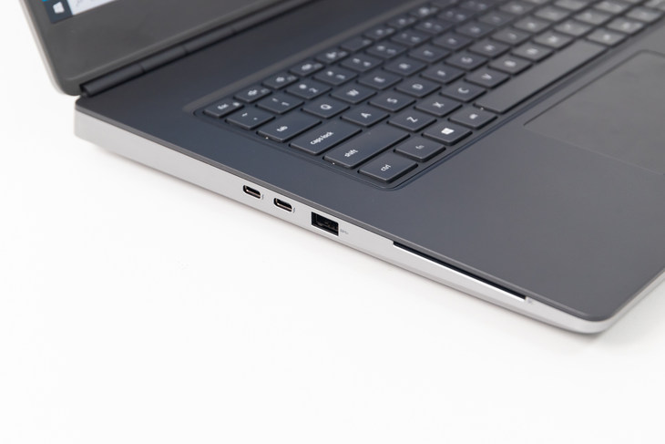 接口部分,戴尔Precision 7750工作站在左侧、右侧、后方三个位置都配备了接口,左侧配备两个USB 3.2 Type-C接口,支持Thunderbolt3.0,还有一个USB 3.2 Type-A接口,还有SC智能卡读卡器。右侧为两个 USB 3.2 Type-A接口(支持Powershare),提供 SD 卡读卡器、3.5mm音频插孔。