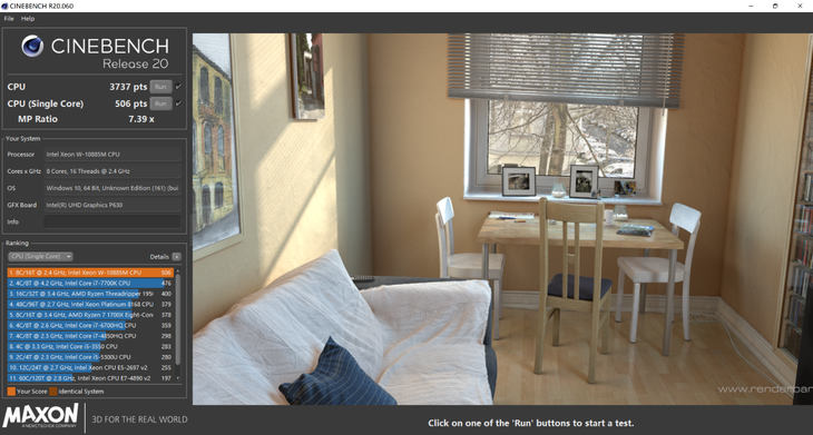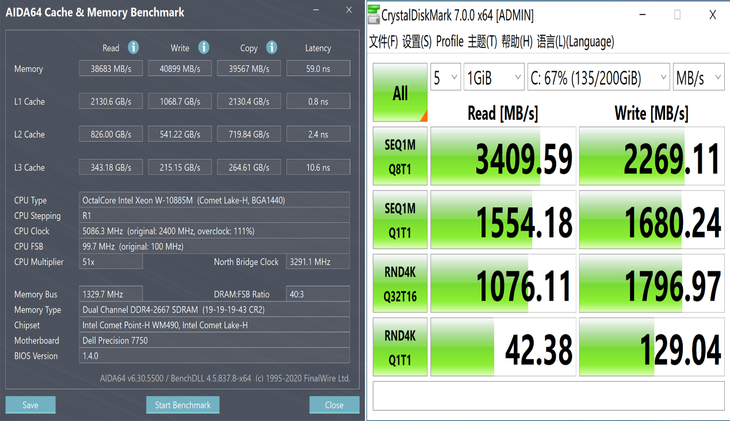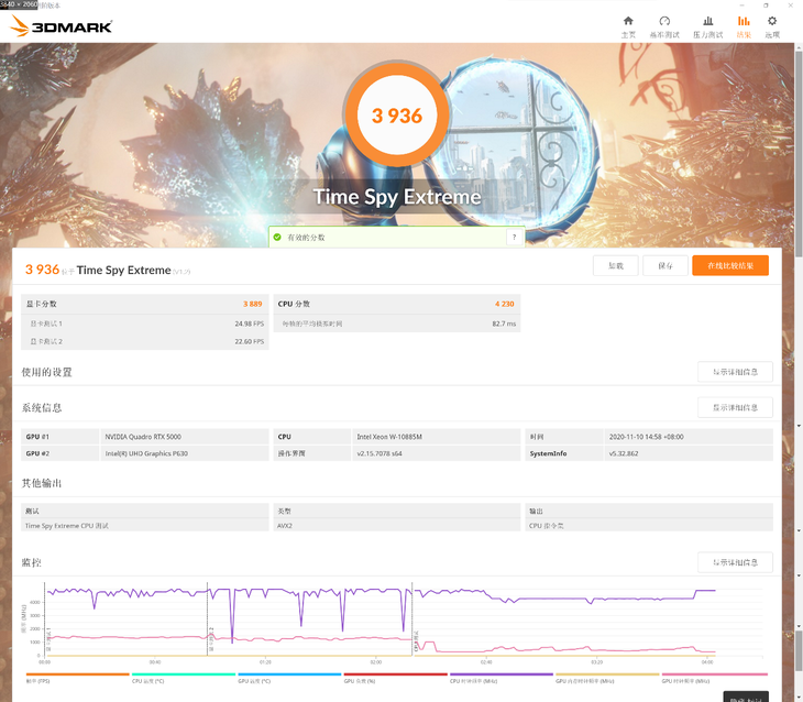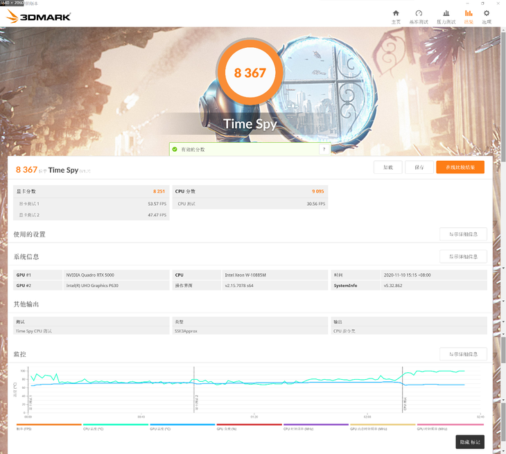 从跑分可以看到,至强 W-10855M处理器的单核、多核处理器的性能都非常强大,可以轻松应对高负荷、多线程任务。