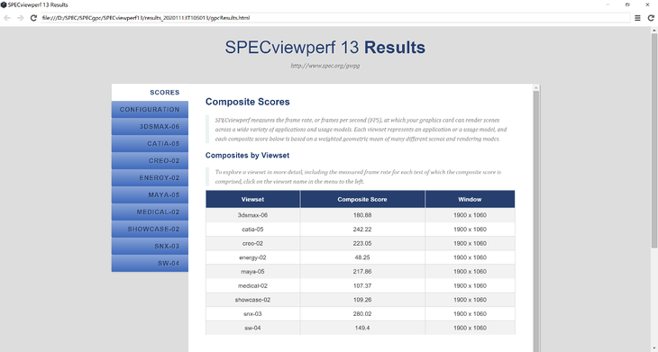 为了更加直观展现这款工作站在专业工作场景的优势,我们使用SPECviewperf 13软件进行专业性能测试。SPECviewperf 13可以测试显卡的专业图形性能,基于真实的专业应用场景进行测试。对于需要使用这类型专业软件的用户来说,测试成绩有非常大的参考意义。