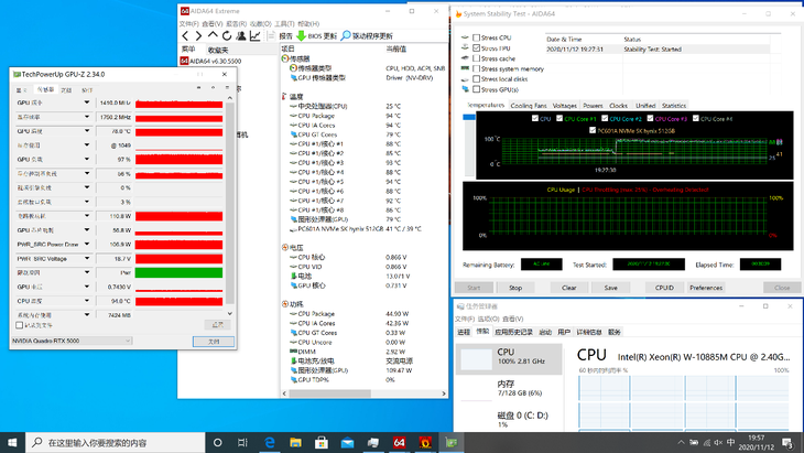 在30分钟双烤后,CPU温度为94度,功耗能保持在45W左右。GPU温度为78度,功耗在110W左右。说明在重度使用场景,戴尔Precision 7750工作站仍旧能够保持优秀的性能释放,提供持续的强劲性能支持。