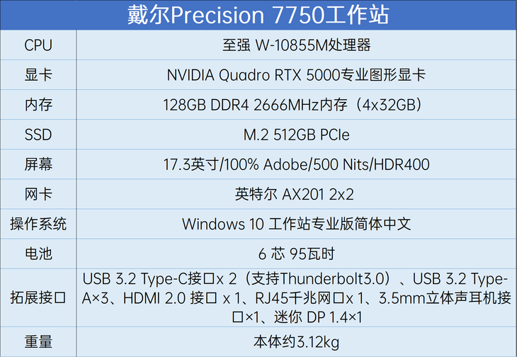 戴尔Precision 7750工作站采用高端硬件配置,针对专业用户进行定制优化,可以给专业用户提供更加强劲、高效的性能支持。评测版机为英特尔至强 W-10855M处理器+NVIDIA Quadro RTX 5000专业图形显卡组合,这些都是为专业用户量身定制的硬件。