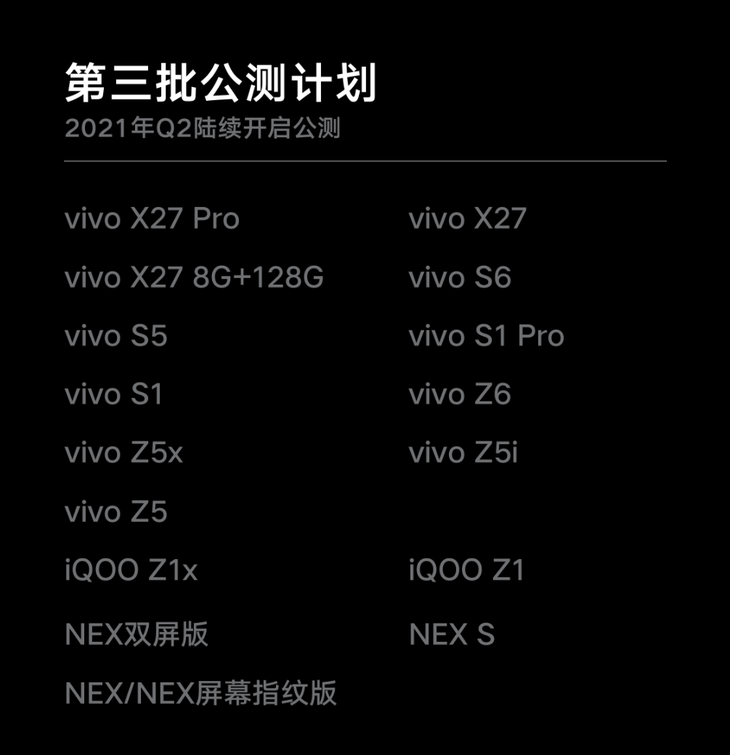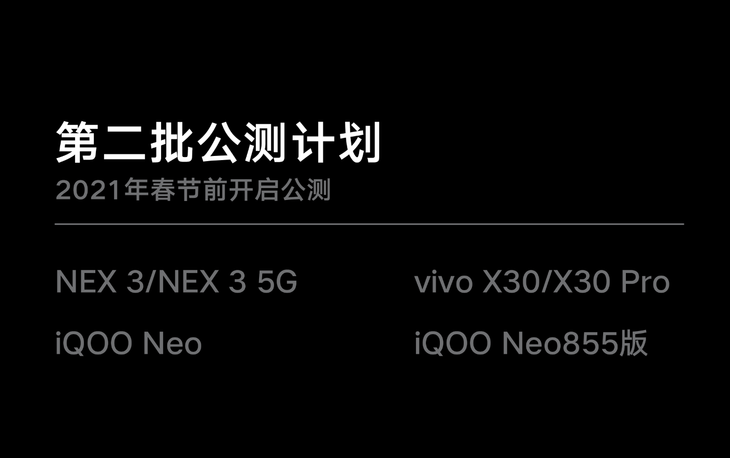 第二批升级机型包括NEX 3、X30、iQOO Neo等机型,预计会在2021年春节前开启公测。