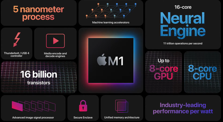 M1芯片采用ARM架构、5nm工艺打造,封装了160亿个晶体管。CPU为8核心设计,包括4个高性能核心以及4个高能效核心。GPU方面同样也是8核心设计,还配备了16核的神经网络引擎、集成内存以及加密芯片。
