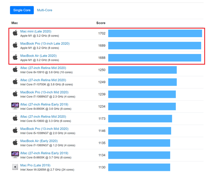 在理论性能方面,M1芯片的Geekbench5单核跑分高达1702,单核理论性能已经轻松超越采用英特尔处理器的Mac产品。