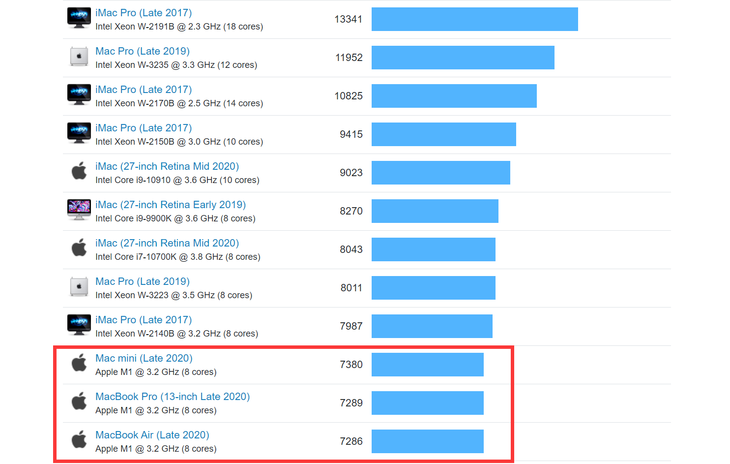 在Geekbench5的多核跑分中,M1芯片的跑分可达7380,也已经超越了采用英特尔芯片的苹果笔记本产品。虽然比不上苹果台式机产品,但这样的表现已经让人感到相当惊喜。