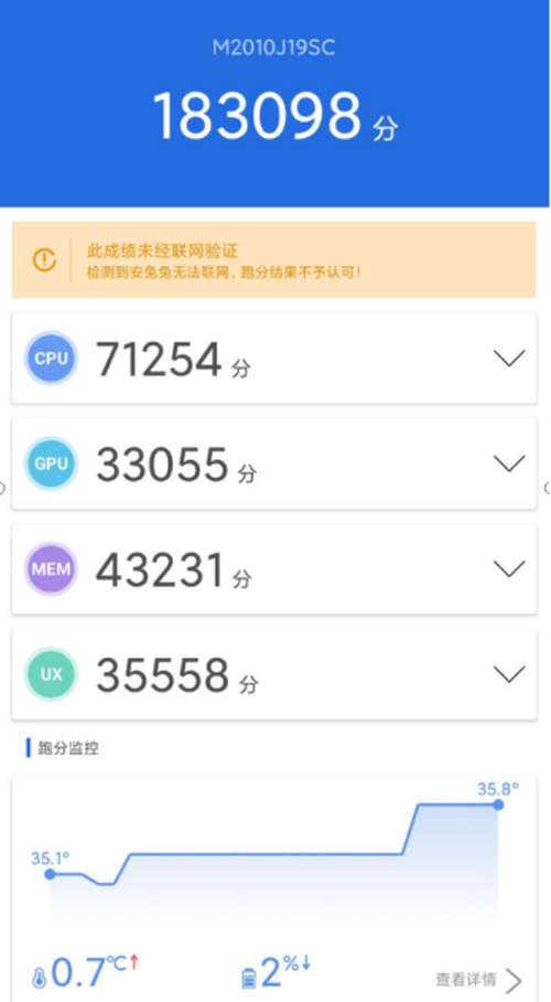 安兔兔得分183098,跑分相较骁龙665略有提升。