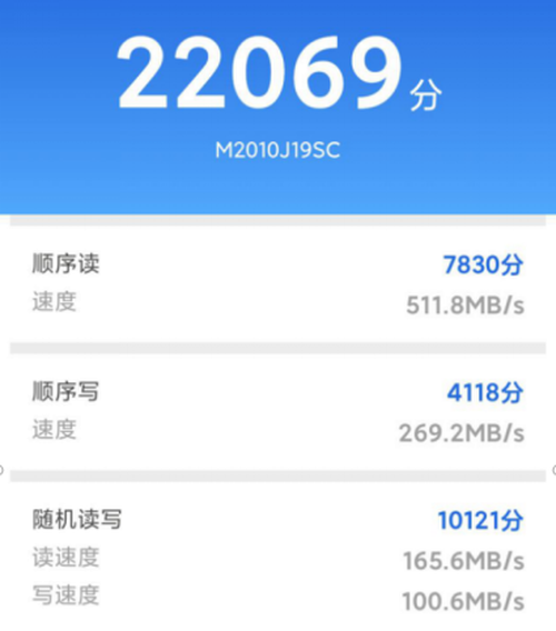从安兔兔的存储性能跑分测试来看,UFS2.2相较UFS2.1有着不小的性能提升。