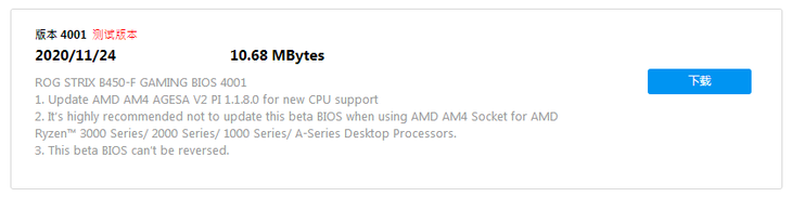 目前华硕官方已经放出了一版测试版BIOS,拥有这款主板的玩家们想体验锐龙5000系列处理器的话可以下载使用。