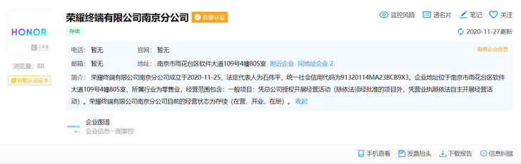 在和华为分离后,新荣耀最近成立了多家新公司。根据企查查的信息,在11月25日,新荣耀成立了荣耀终端有限公司南京分公司,负责人为石伟平,属于零售业,经营范围为:一般项目:凭总公司授权开展经营活动(除依法须经批准的项目外,凭营业执照依法自主开展经营活动)。