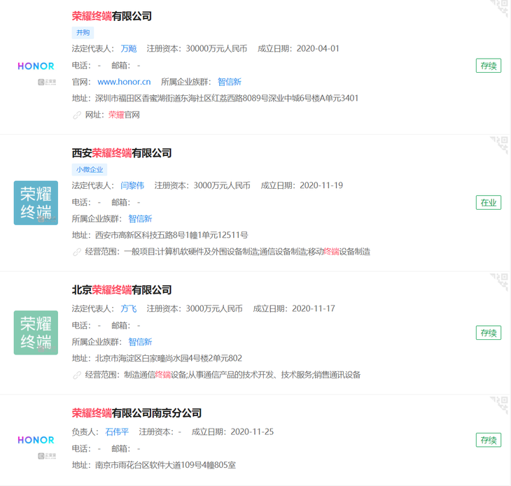 荣耀终端有限公司南京分公司属于荣耀终端有限公司,荣耀终端有限公司由深圳市智信新信息技术有限公司100%控股,也就是此前荣耀的收购方。除了刚成立的南京分公司,深圳市智信新信息技术有限公司还投资成立了西安荣耀终端有限公司、北京荣耀终端有限公司。毫无疑问的是,这些新公司未来都会为新荣耀服务,是新荣耀的一部分。
