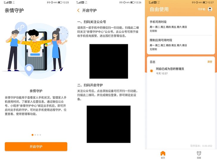通过桌面的亲情守护图标可以进入亲情守护功能,在APP界面会提供两个二维码,一个为关注公众号,扫描另一个可以绑定设备。通过微信扫码就可以绑定设备,启用亲情守护功能步骤简单,难度不高。