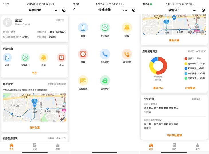 绑定设备后,可以通过微信公众号上的小程序对已绑定的手机进行管理。绑定手机的电量、存储空间、数据用量、步数等信息都一目了然。还可以查看APP的使用时间。