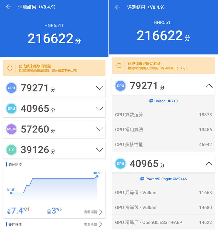 海信5G手机F50+搭载紫光展锐的虎贲T7510平台,采用12nm工艺,为虎贲T710处理器+春藤V510 5G基带组合,可以实现SA/NSA双模5G。其中虎贲T710处理器CPU部分为4个A75+4个A55的八核心设计,GPU为PowerVR GM9446,评测机为6GB+128GB存储组合。