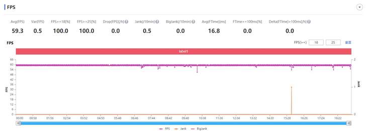 在《王者荣耀》的测试中,除了分辨率不能开到超高,其余特效均为全开。软件记录的平均帧数为59.3帧,游戏全程帧率波动都很小,可以保证很流畅的游戏画面,操作跟手,多人团战也不用担心卡顿。