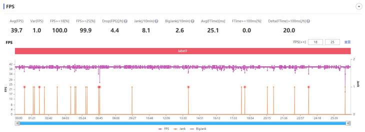 《和平精英》的测试中,在均衡画质设置下,可以开启超高帧数,其它特效全开。软件记录的平均帧数为39.7帧,游戏画面的流畅度比较稳定,在开车对战等场景波动也不大。