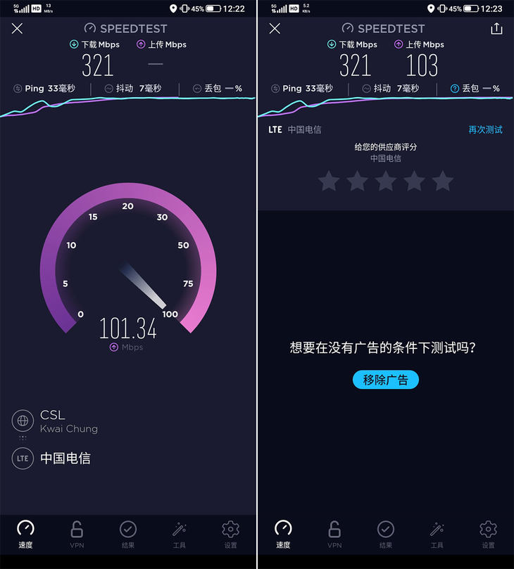 在5G网络体验上,海信5G手机F50+可以轻松跑到限制速度,完全可以满足体验高速5G网络的需求。实际上,不需要开通5G套餐也能享受到网速提升。使用只开通4G套餐的电信卡(限速300Mbps)进行测试,实际可以达到320Mbps的下载速度,103Mbps的上传速度,这样速度已经远超4G网络。如果你开通了5G套餐,还能够达到更快的速度。